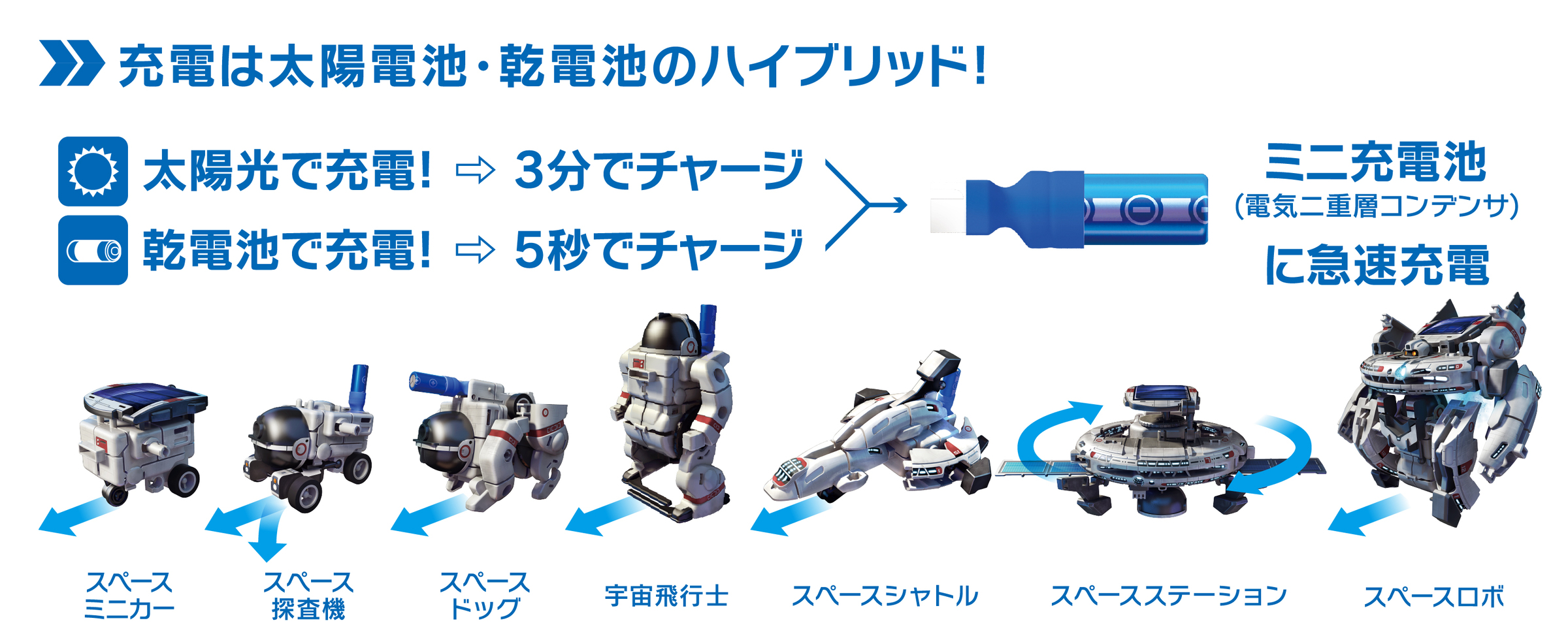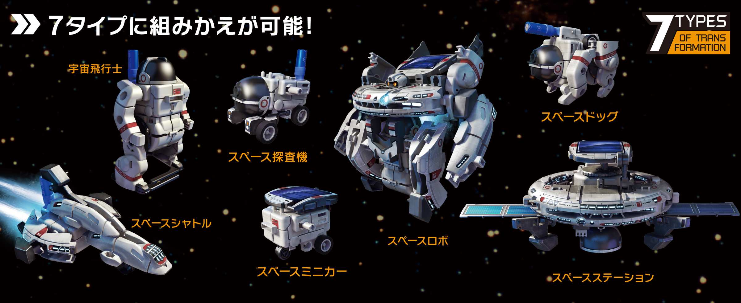 また、簡単に部品が組み替えられるので、宇宙飛行士やスペースシャトルなど宇宙で活躍する7タイプのロボットや乗り物に変身させることもできます。