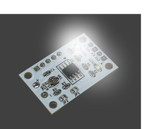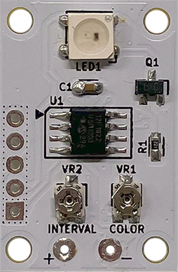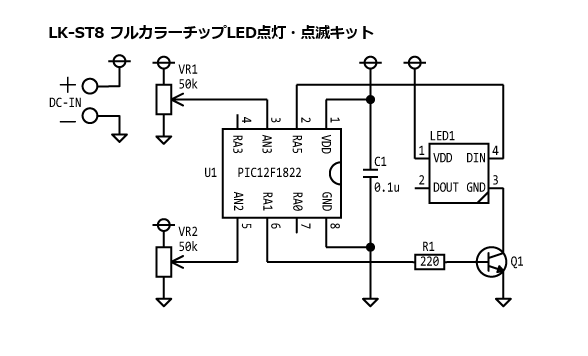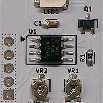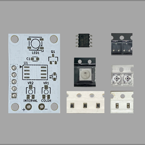 チップ形の抵抗、トランジスタに加えて8ピンの表面実装ICやチップ半固定抵抗、4ピンのフルカラーチップLEDのはんだ付けに挑戦できます。