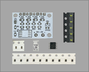 チップ形の抵抗、LEDに加えて8ピンの表面実装ICやチップ半固定抵抗のはんだ付けに挑戦できます。