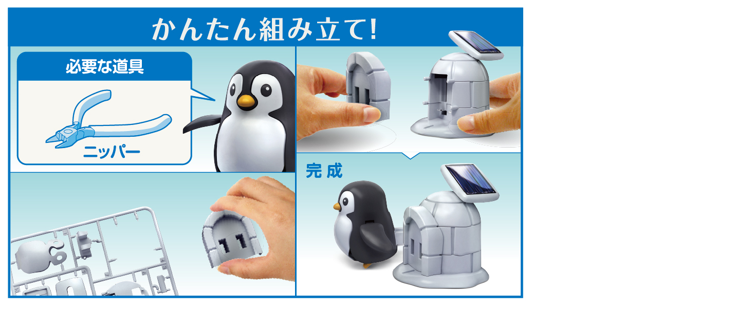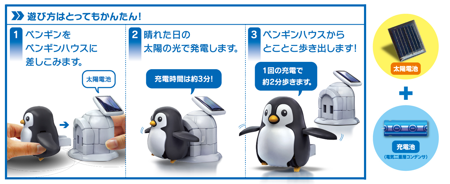太陽電池で発電した電気エネルギーをミニ充電池にためて動くペンギンとアイスドーム(ペンギンハウス)のセット。